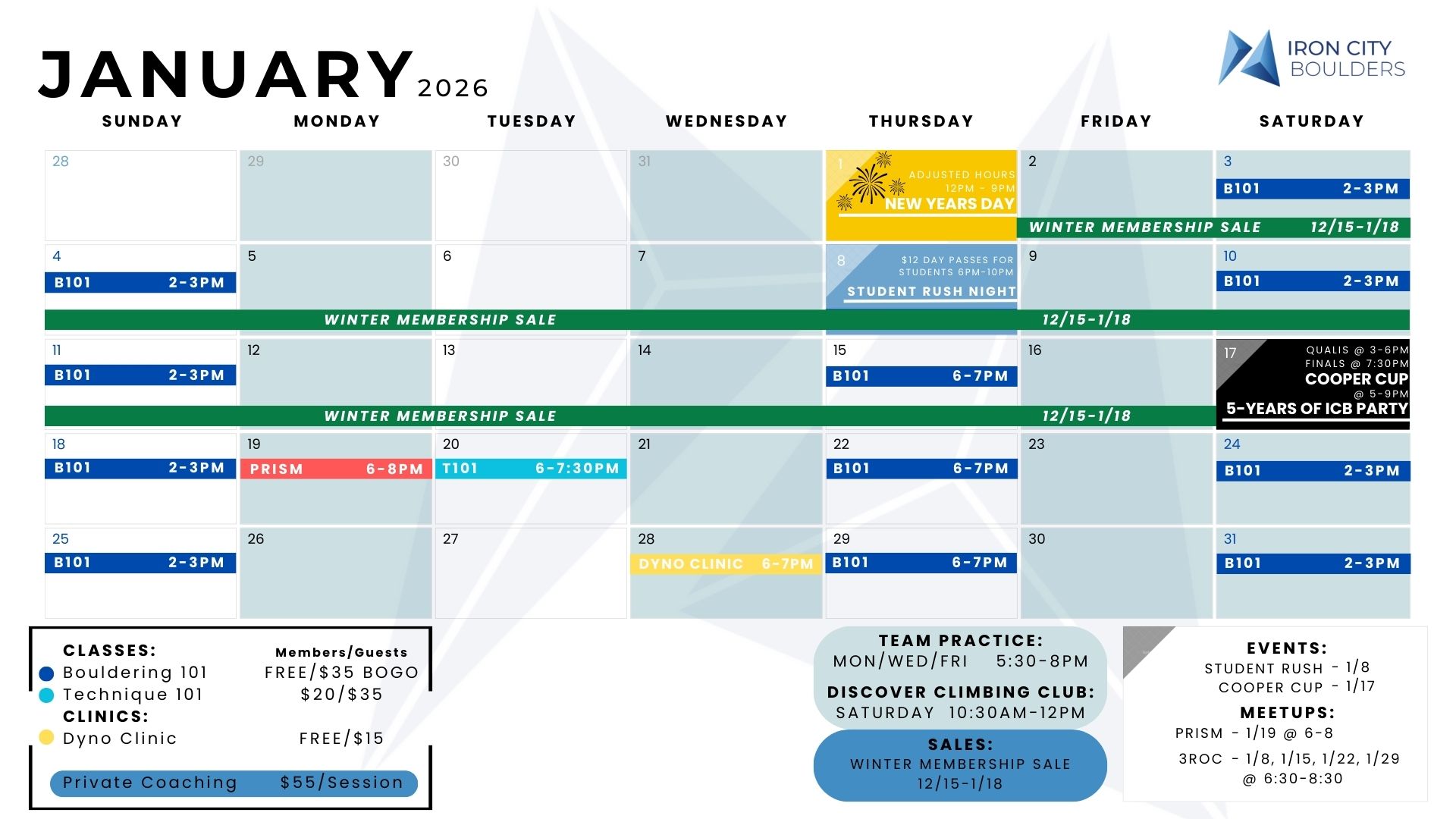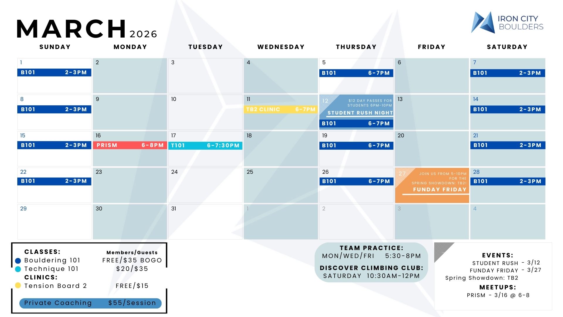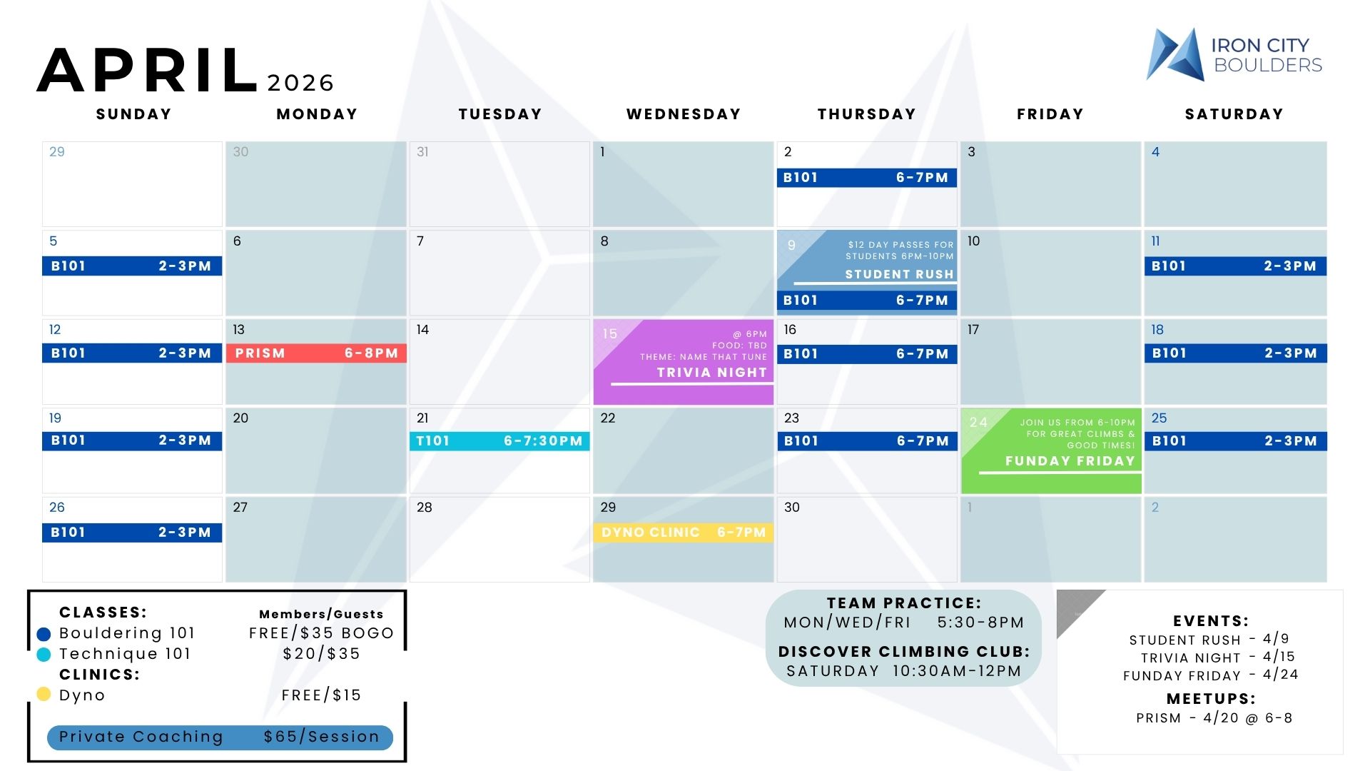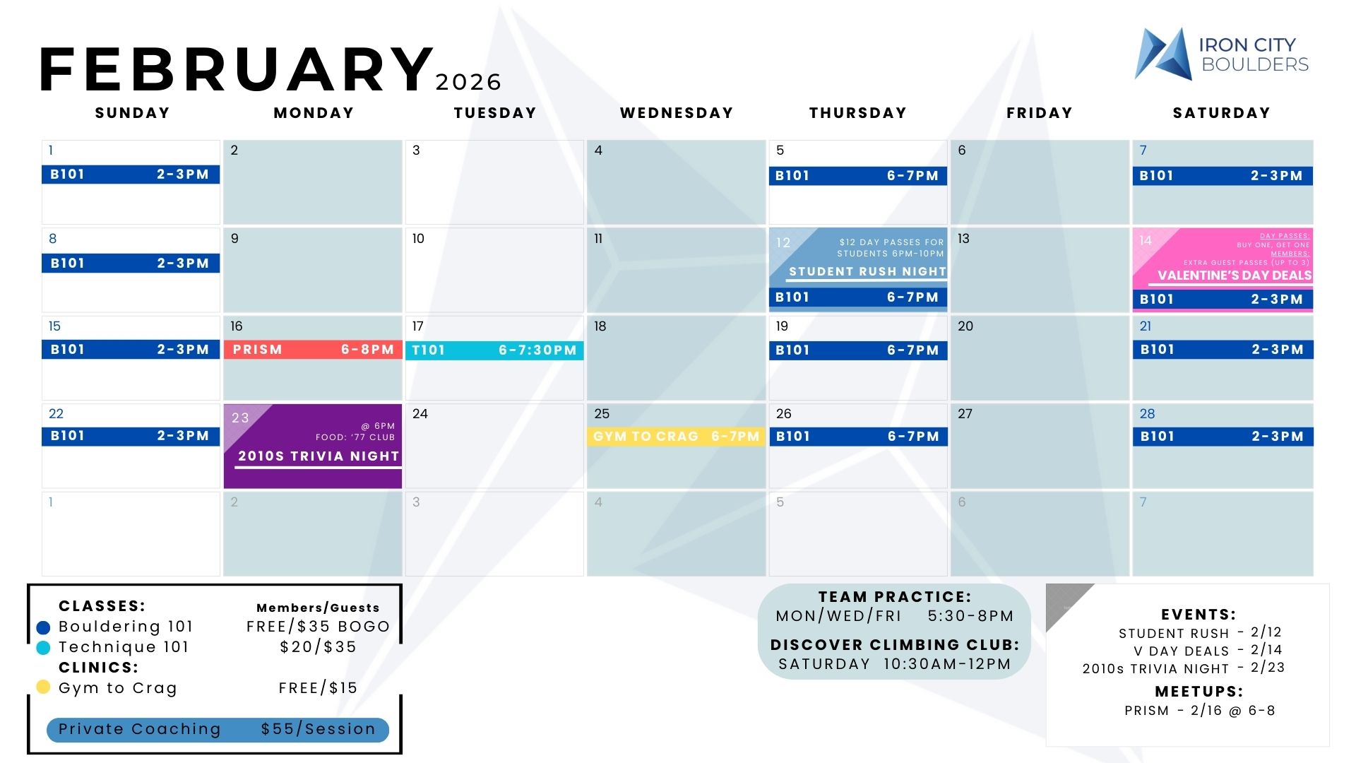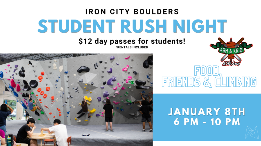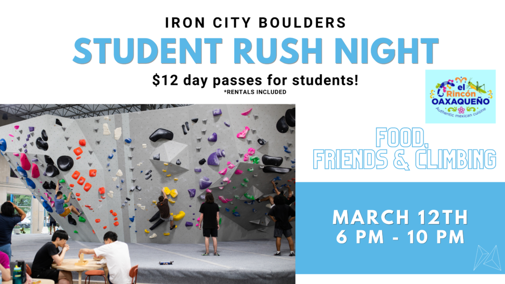 Check out this month’s climbing events, student nights and community events!