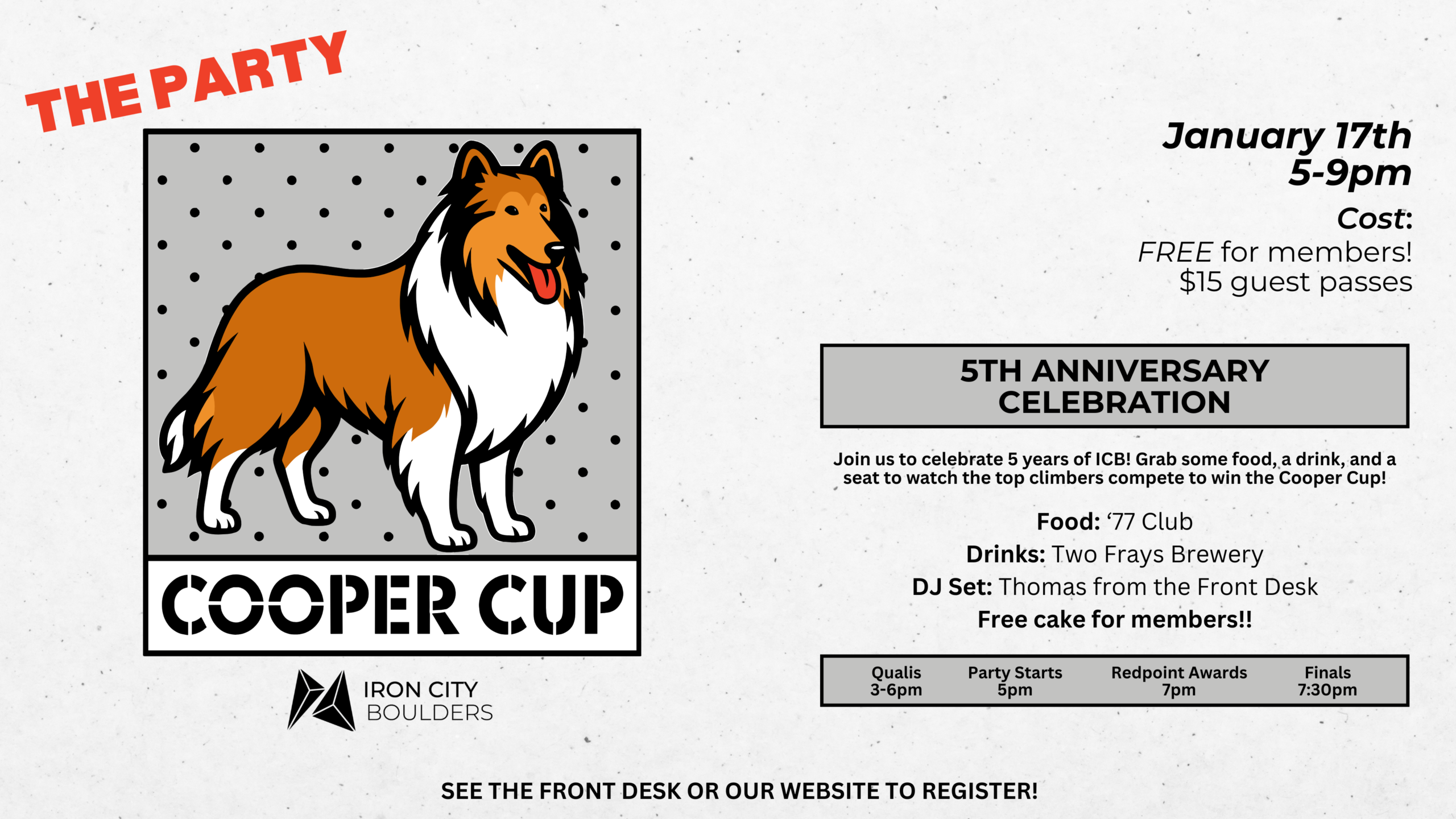 Join us to celebrate 5 years of ICB! Grab some food, a drink, and a seat to watch the top climbers compete to win the Cooper Cup!